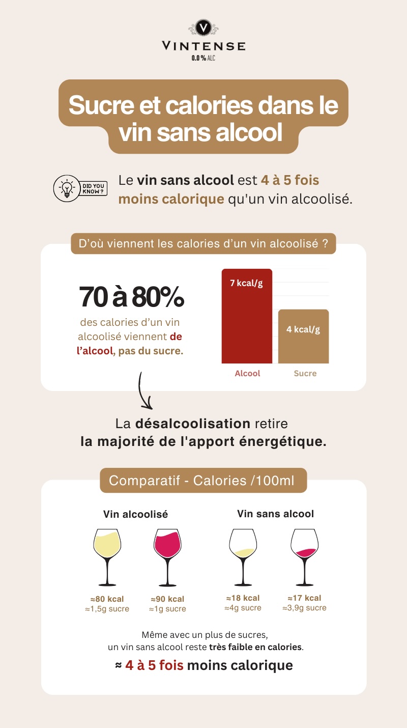 Même avec un léger supplément de sucres, un vin désalcoolisé reste très largement moins calorique qu’un vin classique. Quelques grammes de sucre destinés à rééquilibrer le vin apportent très peu d’énergie, alors que l’alcool fait immédiatement grimper la valeur calorique d’un vin traditionnel.