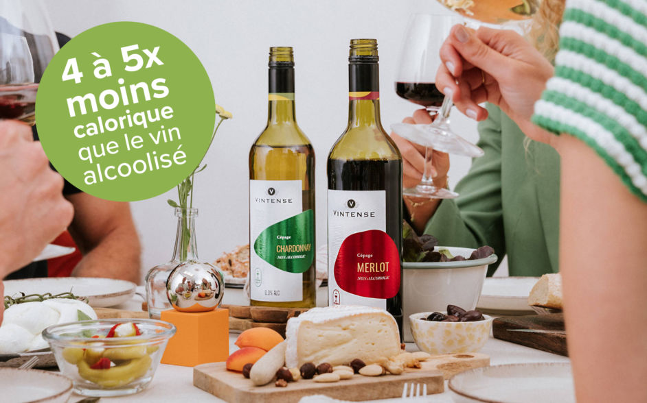 Chez Vintense, les vins sans alcool se situent généralement entre 17 et 24 kcal pour 100 ml, contre 70 à 95 kcal pour un vin alcoolisé de même volume.